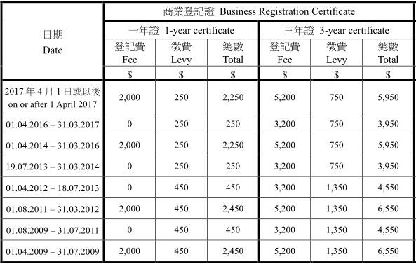 香港稅務局商業(yè)登記費歷年收費參見下表: